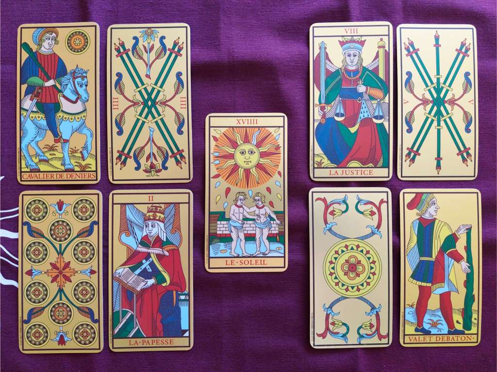 Posibles dificultades: La Justicia, 5 de bastos, as de oros y sota de bastos.